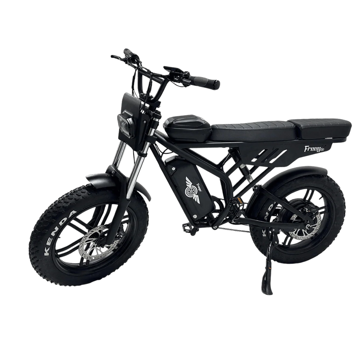 Fatbike électrique ultra puissant équipé d’un moteur 1400 W, vitesse limitée à 25 km/h en configuration route, batterie haute capacité 48V 20Ah (~960Wh) et autonomie annoncée jusqu’à 80 km selon conditions. Conçu pour trajets dynamiques, routes variées et chemins roulants.